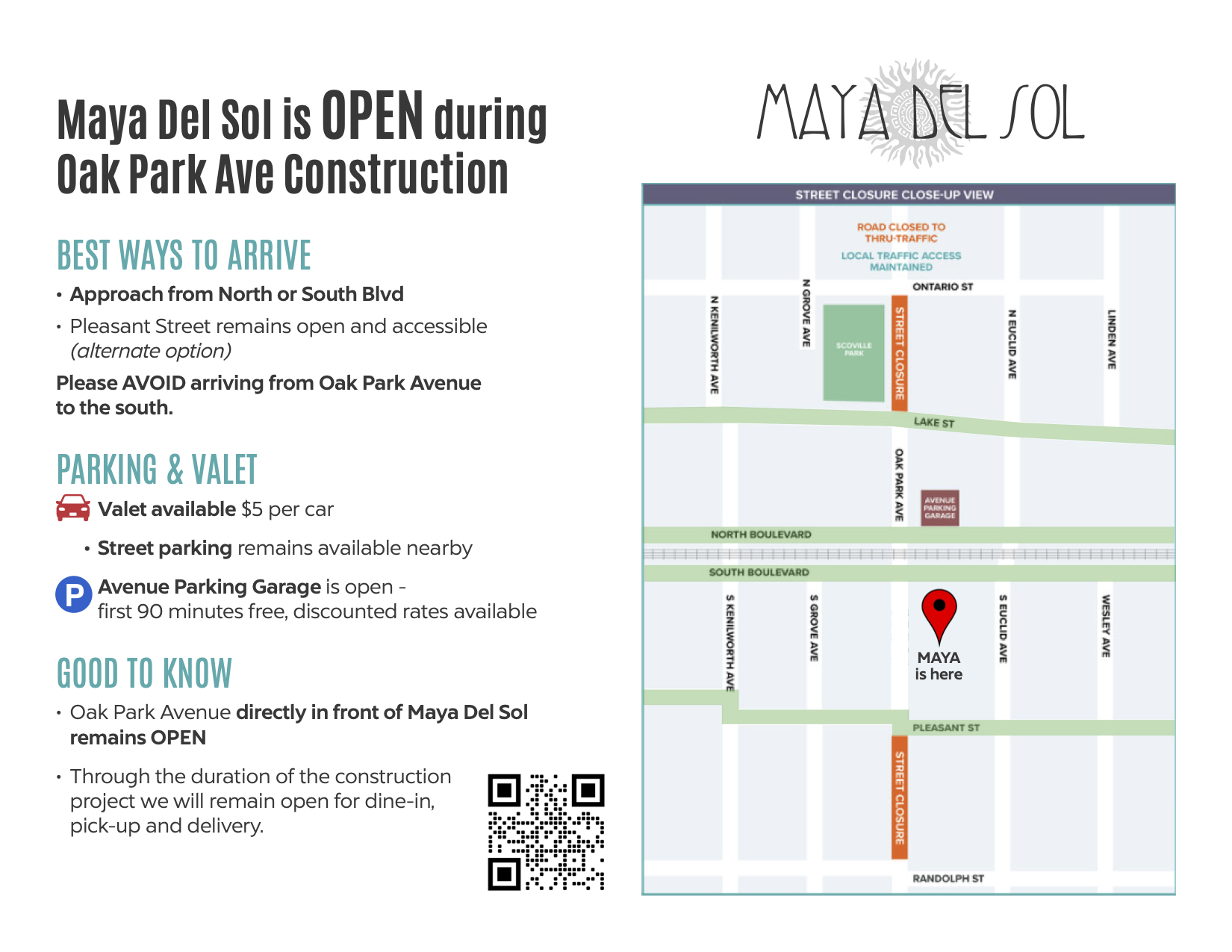 We wanted to share a quick update regarding construction that has begun on Oak Park Avenue as part of the Renew the Avenue infrastructure improvement project. While this work will continue in stages through the fall, Maya Del Sol remains fully open and accessible.